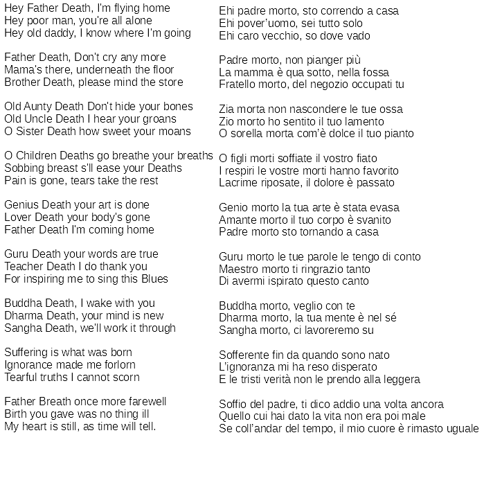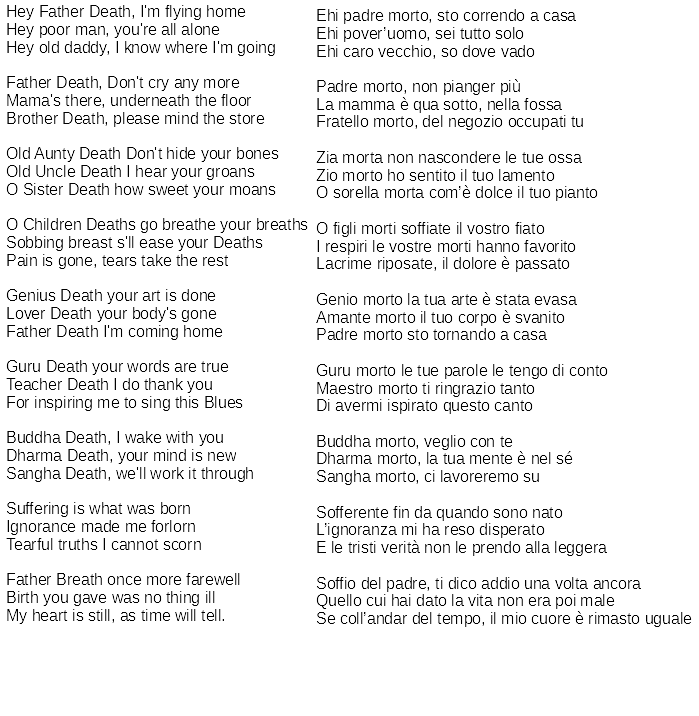 31 luglio 2025 gianfrat Father death blues nella traduzione di Giancarlo Micheli Il Blues del padre morto verrà letta da Giancarlo Micheli nella rassegna Tramontinversi venerdì 1 agosto a Villa Argentina Viareggio Allen Ginsberg 1976 Condividi: Condividi su X (Si apre in una nuova finestra) X Condividi su Facebook (Si apre in una nuova finestra) Facebook Invia un link a un amico via e-mail (Si apre in una nuova finestra) E-mail Condividi su LinkedIn (Si apre in una nuova finestra) LinkedIn Mi piace Caricamento... Correlati